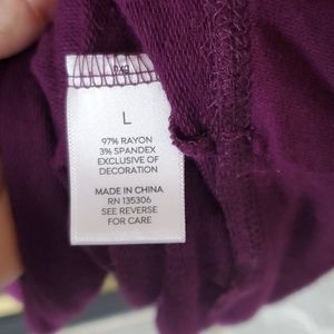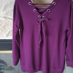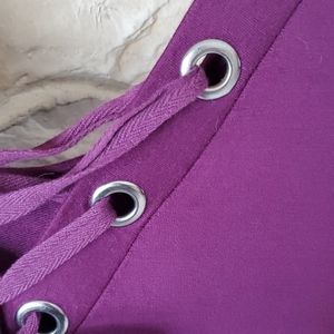 Lace detailing in front, with tie detailing in back. Tie runs through rivets and is adjustable. Color is more of a lighter merlot. Not the bright fuschia as shown. Dress Barn brand.