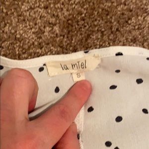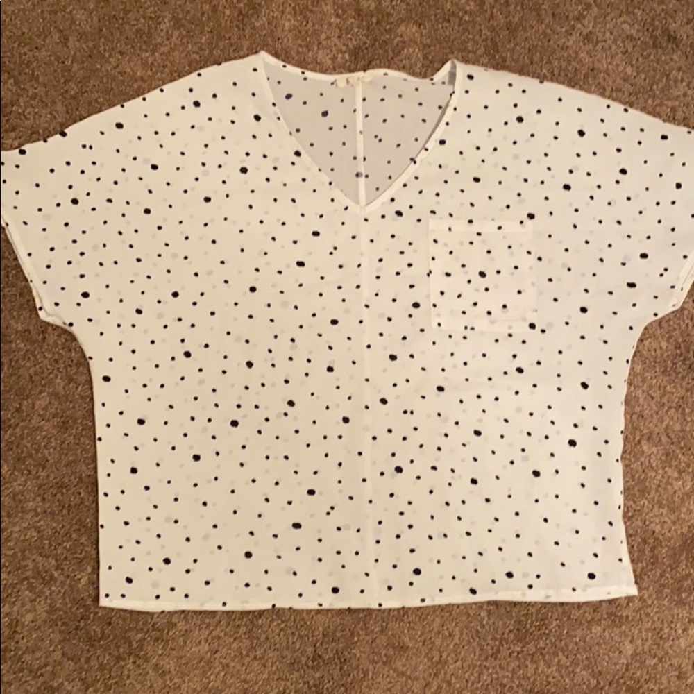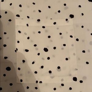 Black and white polka dot top with functional pocket on left side. Has a v neckline.