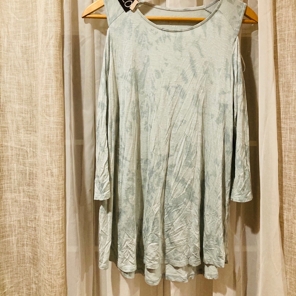 3/4 sleeve of the shoulder, open shoulder, light blue green top