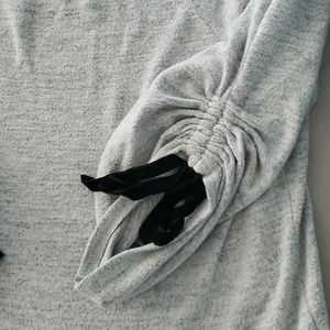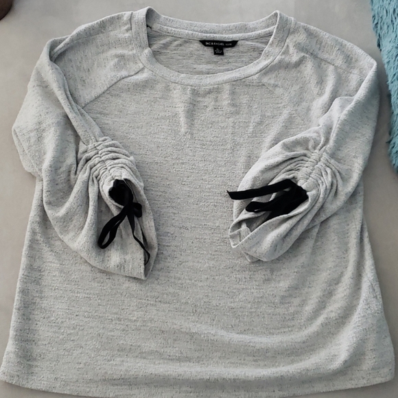 Lt. gray round neck top with 3/4 length sleeves that are tied with velveteen ribbon. Cute with a pair of black jeans and boots!