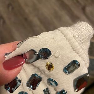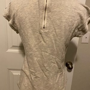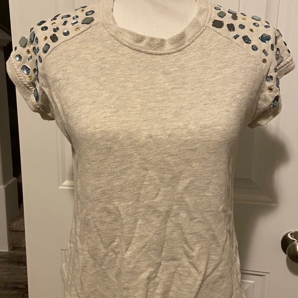 Short sleeve top with blue, silver and clear decorative accents on the shoulders. A few of the sequins are loose as shown in the photo but will be very easy to tighten up with thread. There’s a zipper in the back as seen in the second pic.