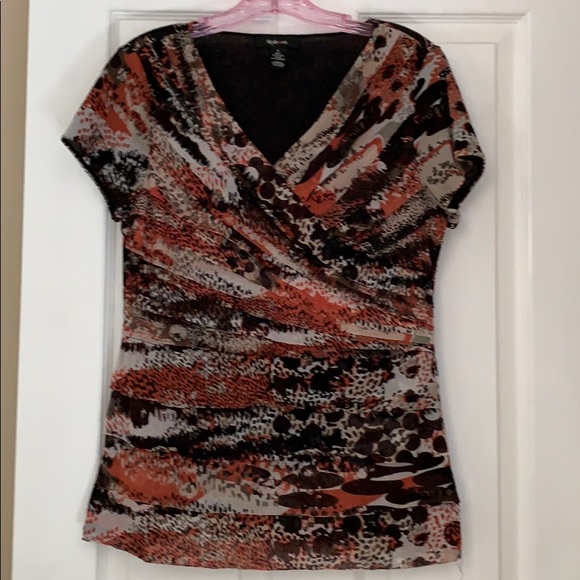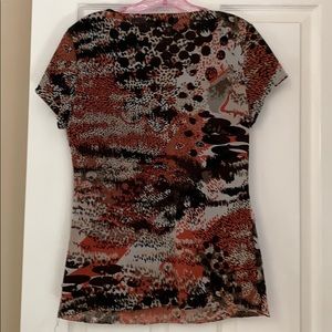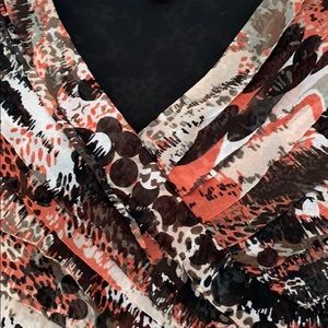 Dressy top, polyester, black and orange, slim fit, ruffled front