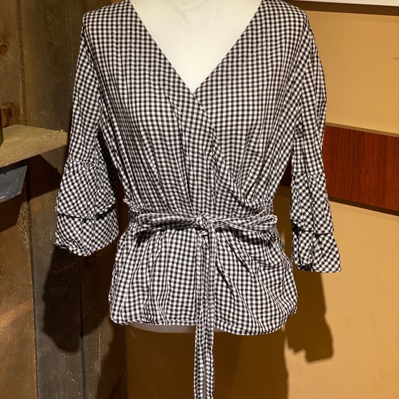 Crossover wrap top with tie and ruffle sleeves. Black & white gingham
