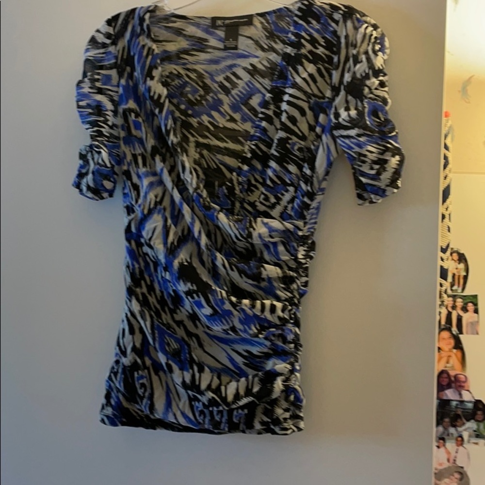Think Spring! Beautiful and light weight V-neck top, ruched on the sides and sleeves. Long waisted. Worn once. Blue, grey & Black.
