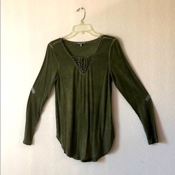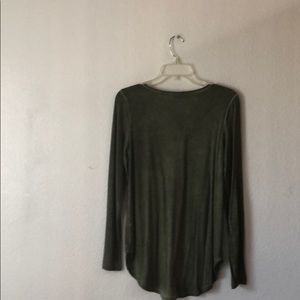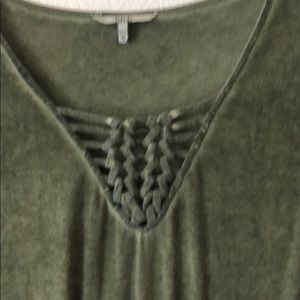 This olive green top has a tie dye effect with slight changes in color. This is more noticeable in the woven neckline. Great with jeans!