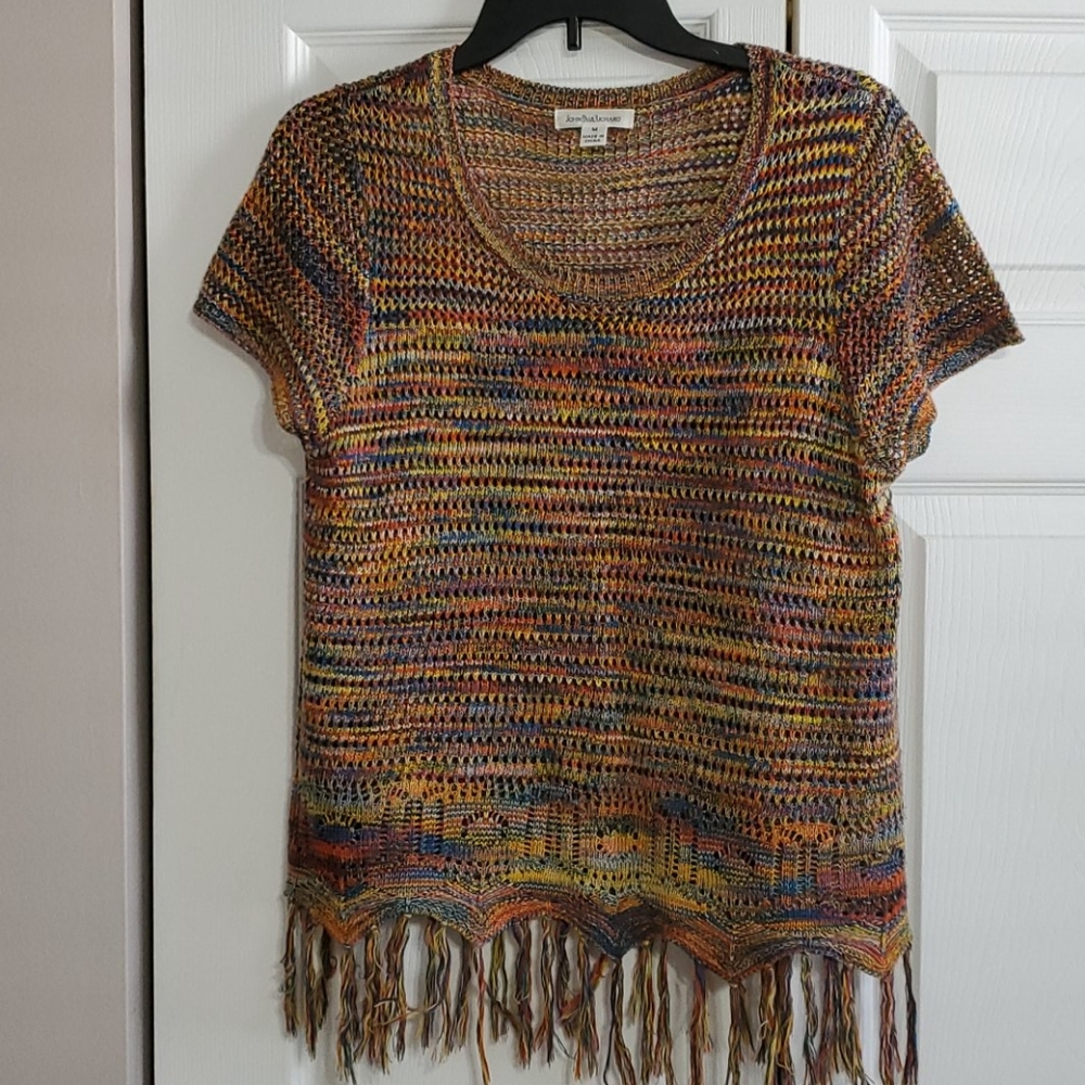 Fun multicolored loose knit top with fringe on the bottom.