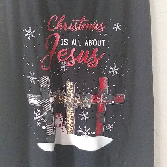 Black no sleeves ..60% cotton 40% polyester..soft says " Christmas is All About Jesus" with 3 crosses below words...excellent cond.