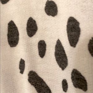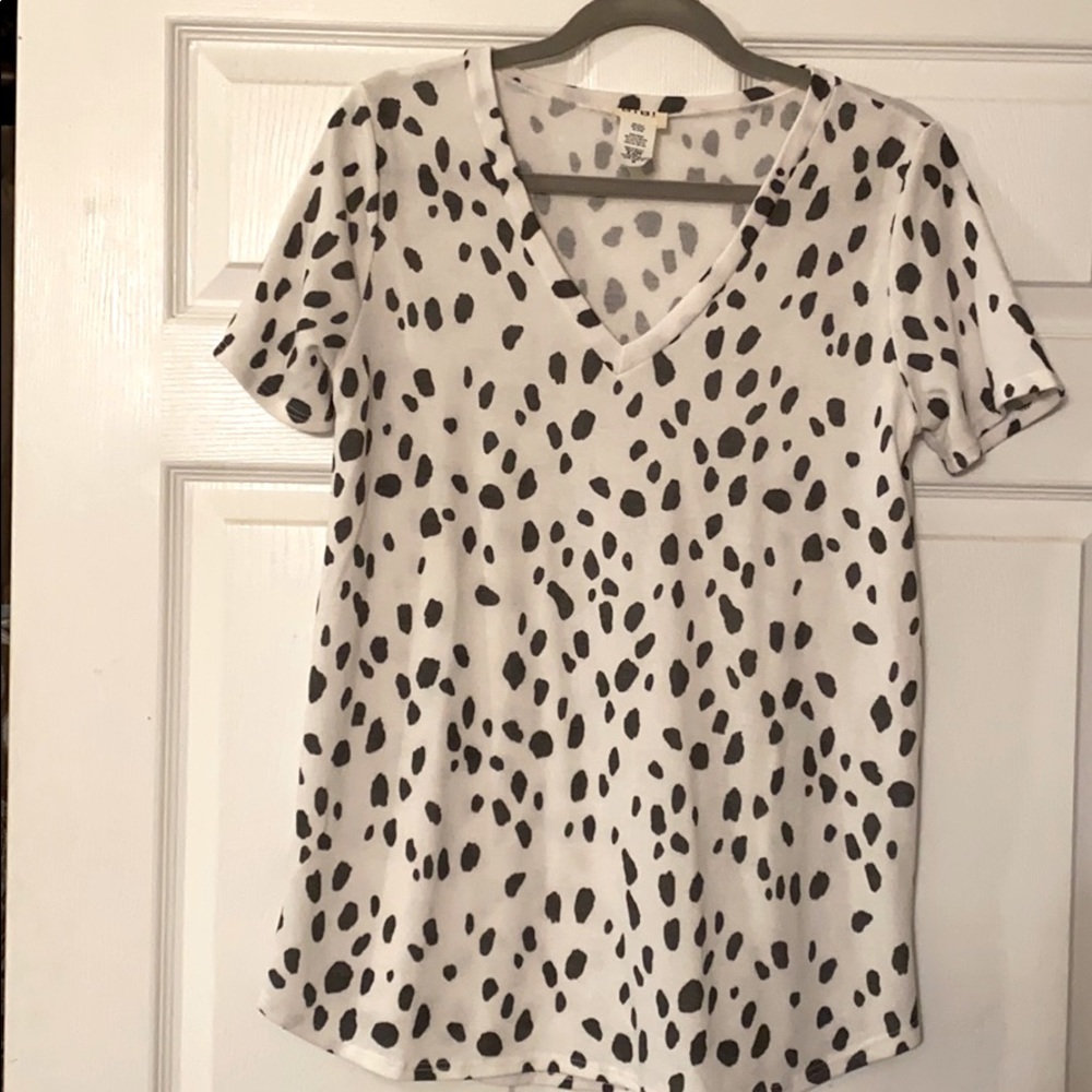 V neck Dalmatian print; true to size 63% Polyester 34% rayon 3% spandex