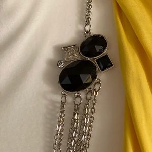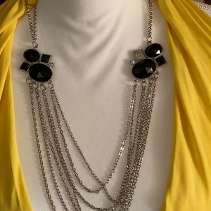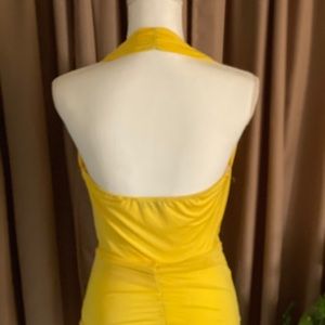 Yellow low cut halter backless top. Ruching in front at waist. Silver chain with gems gives appearance that your wearing a necklace. 1 gem is missing but the chain can be removed easily.