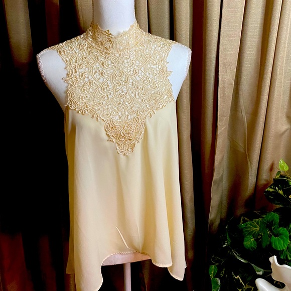 Cream sheer flowy material with lace in front and back. Ties into a bow at back of neck.