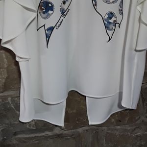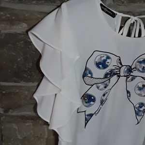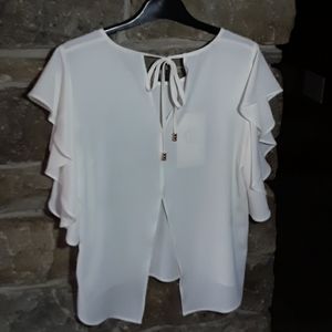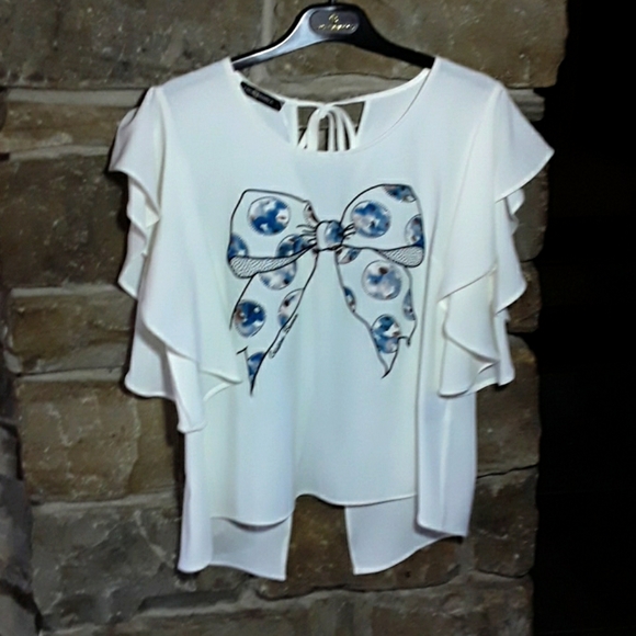 Flutter sleeve top in Ivory crepe with oh decoration and tie back. Longer in the back and the back is split at the bottom but still bra friendly.
