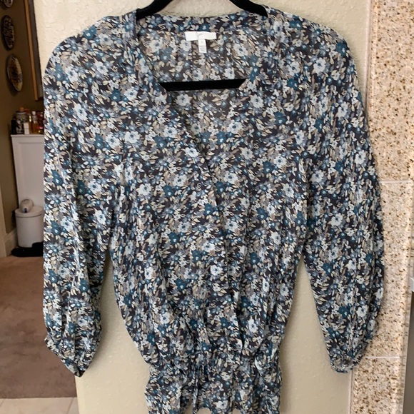 Joie, silk/soie elasticized peplum waist. Blue flowered print.