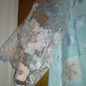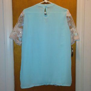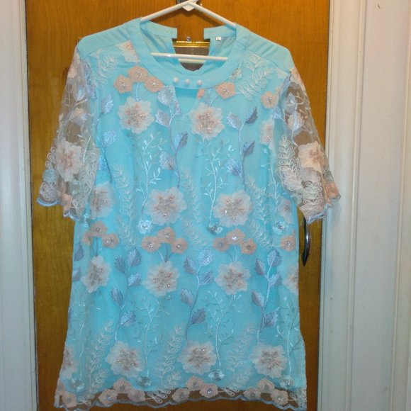 Beautiful top with sheer lace overlay w/scalloped sleeves & pearls around the neckline
