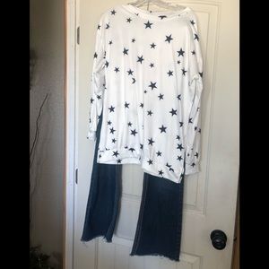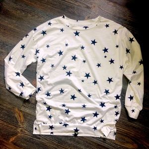 Such a cute fun and comfy shirt ! Fabric is a bit like a sports jersey feel , silky and soft to the touch ! Banded at the hem like a sweatshirt yet split at the sides ! Could be tucked in or worn out .A bit oversized imo. Great for holidays vacay or lounging! A great addition to your wardrobe!