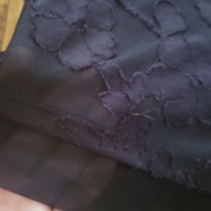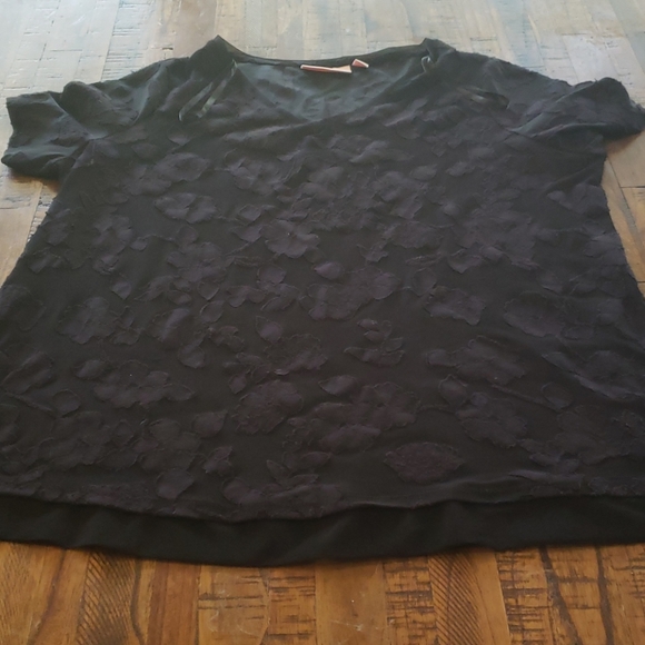 Black floral design vneck top. Would need a tank underneath or if going out maybe just a Black bra. The design is not completely sheer.