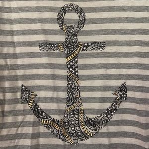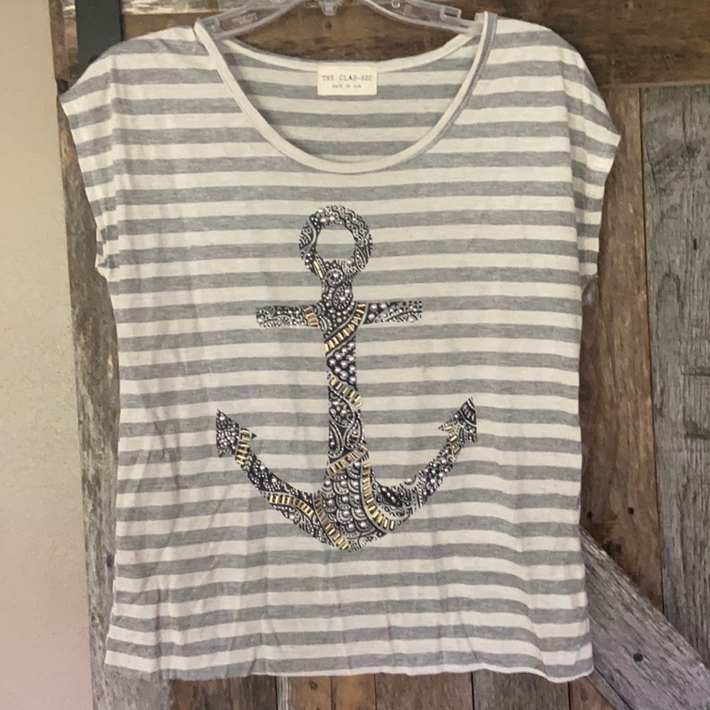 More fitted shirt with white and gray stripes beaded anchor in the front like new smoke free home