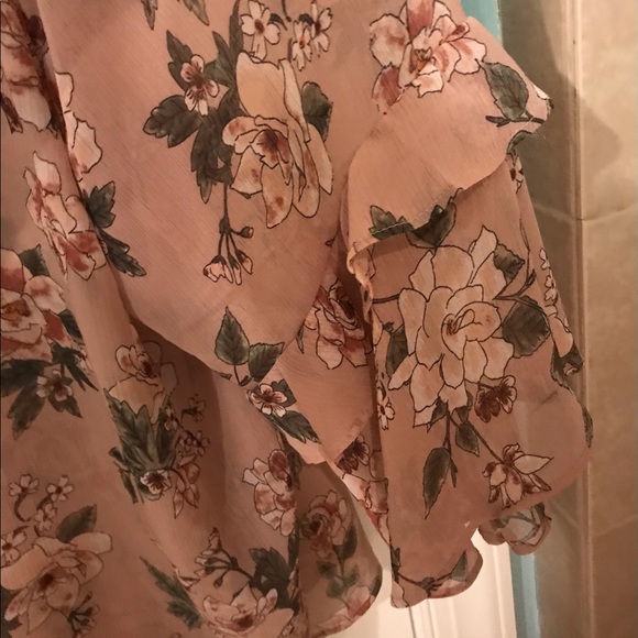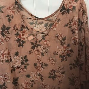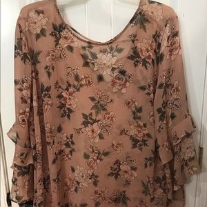 Flowy chiffon floral top, back detail and ruffled sleeves. Dusty pink, floral print;EUC, Torrid size 3