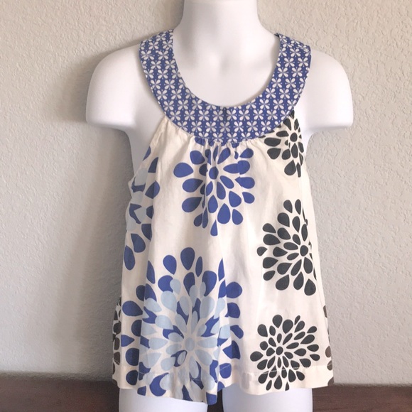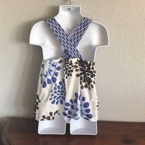 Scoop neck top with adjustable crisscrossed straps in back. White background with royal blue, black and brown flowers. Carters size 3T.