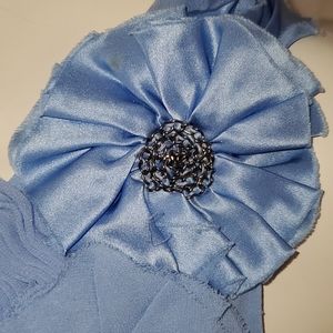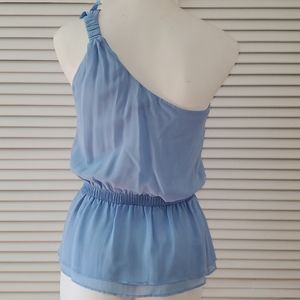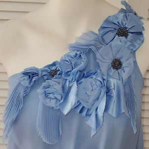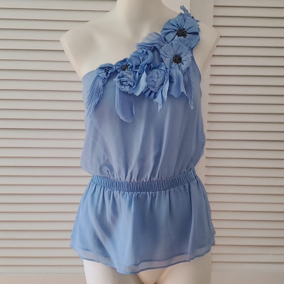 Light blue one shoulder blouse 100% silk Dry clean only Small stain on top flower Worn once