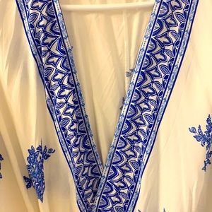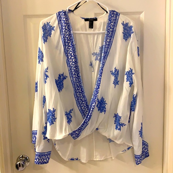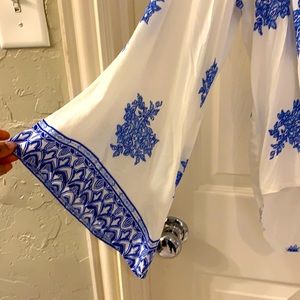 Blue and white v neck high/low blouse with bell sleeves