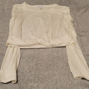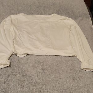 96% rayon 4% spandex long sleeve crop. You can roll the sleeves up with a twist design in front. Sheer and light weight for the summer. New.