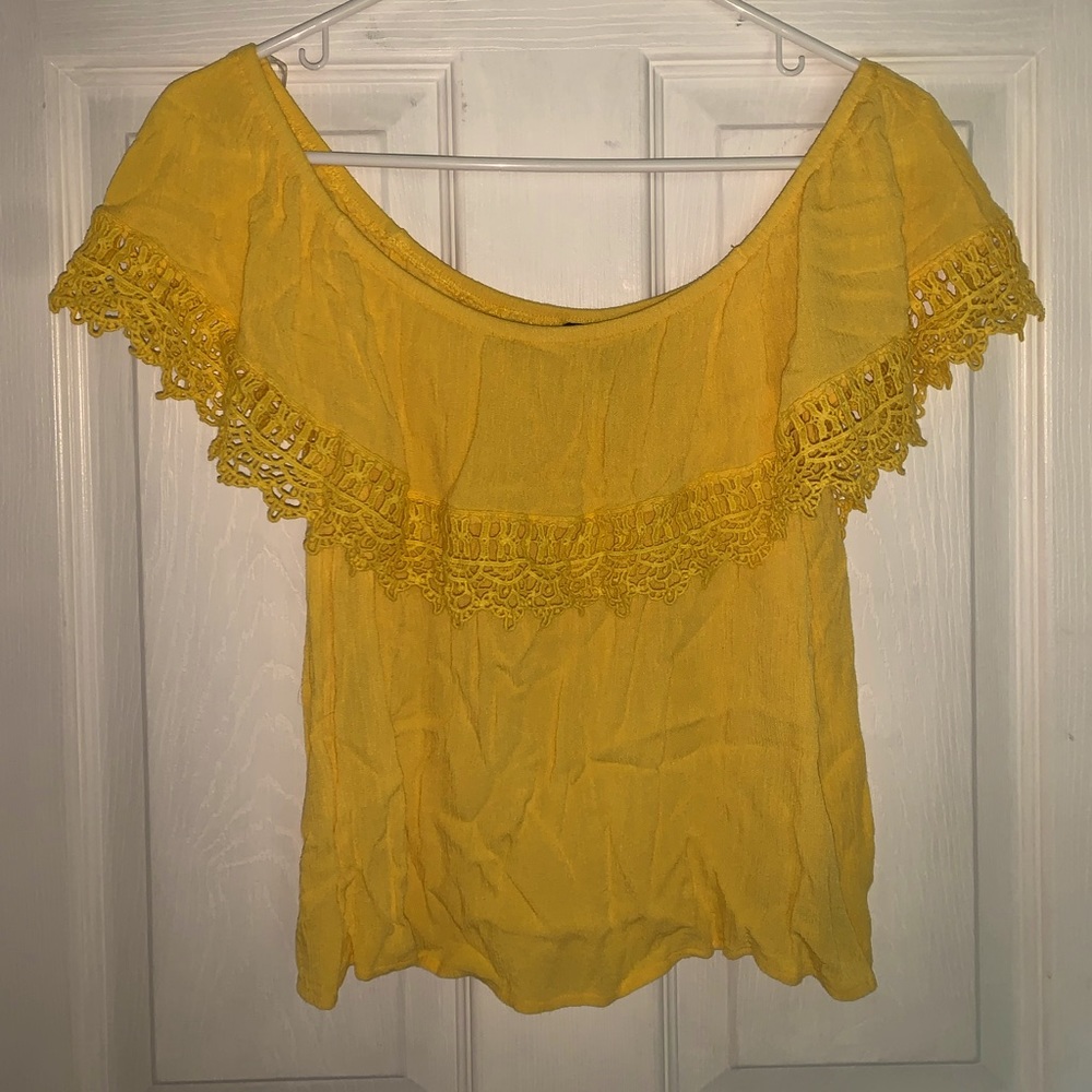 Off the shoulder. Very cute for summer also very breathable. Basically brand new only worn once or twice
