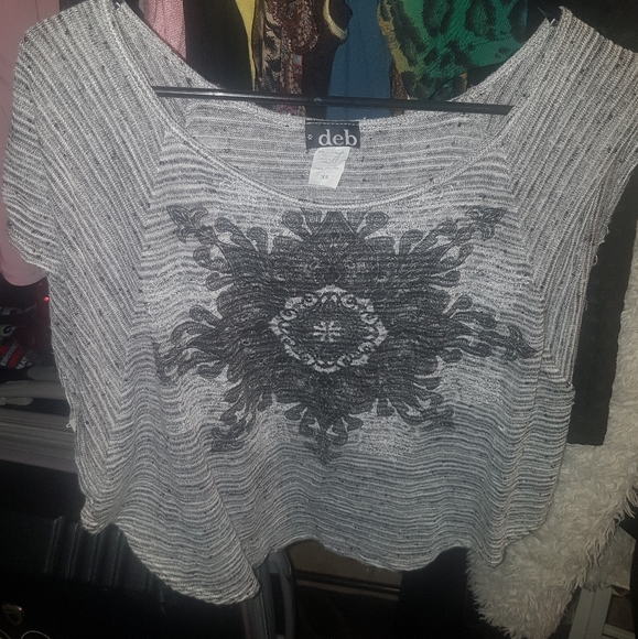 cute shirt with pattern on front.