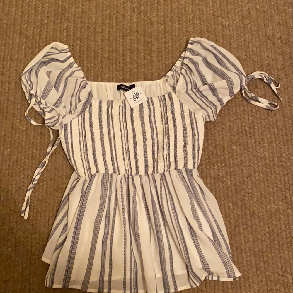 This top has never been worn. It is brand new with tags. It’s super cute!!! It has ties on the sleeves that give it a little extra punch.