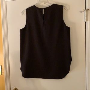 Black sleeveless top with see thru mess at neckline and chest. Keyhole button closure in back. Longer in back, shorter in front at hemline.