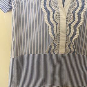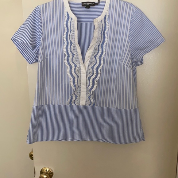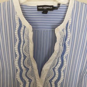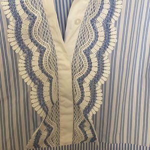 Blue and white lace front top with buttons partially at front
