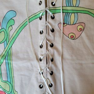 Never worn cream top with ribbon lace up front, has neo pattern on the front.