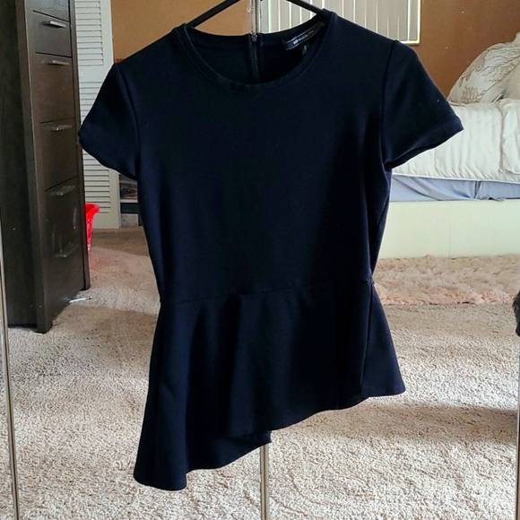 Black shirt short sleeve black sipper in the back .also in the front it's a little slanted puffy. Worn only 1 time.