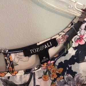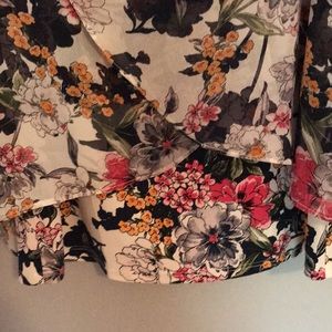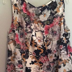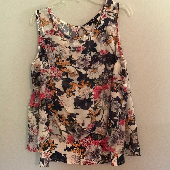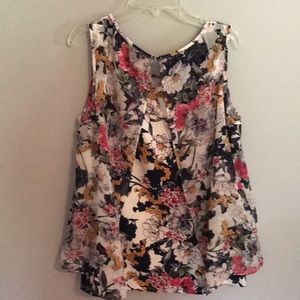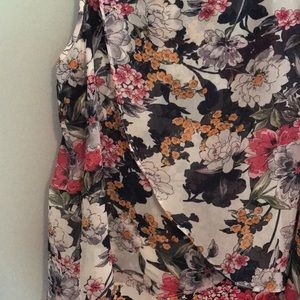 Flowing floral print top with layered front. Round neck. Single clasp closure in back with open top layer. Very light and airy. Great under a suit or with shorts or straight leg jeans. Worn once.