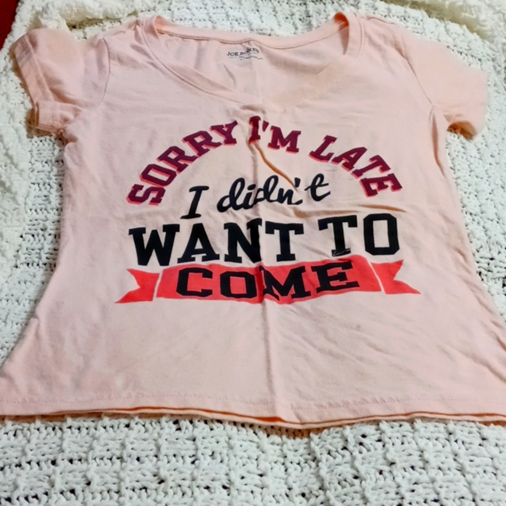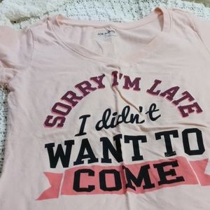Peach color t shirt short sleeve top with saying " sorry i'm late i didnt want to come"