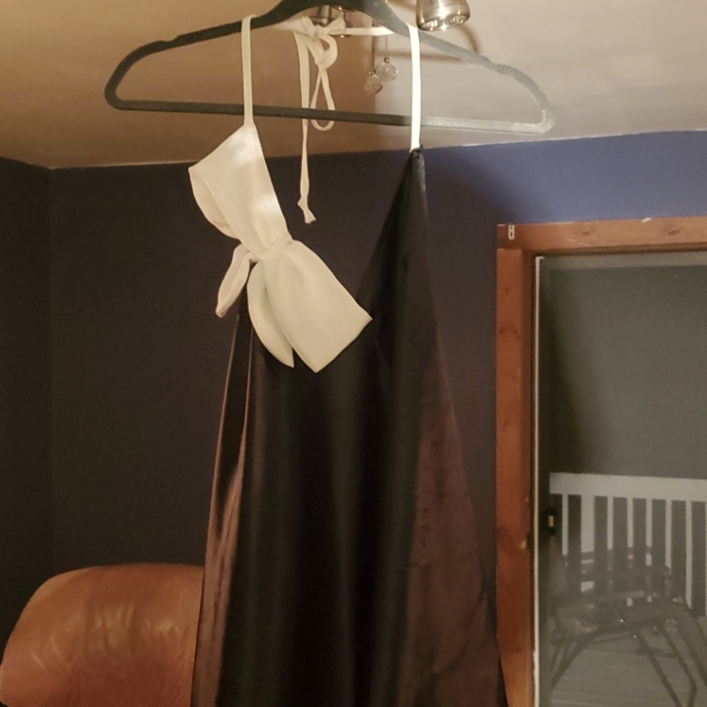 Black with white bow V neck, back side very low V cut, asymmetrical bottom of the back with split at the bottom, sexy but classy top great for going out on dates or with friends