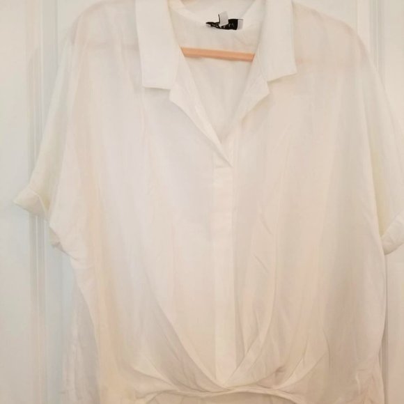 Off white color top in a luxurious rayon poly blend. Wrap front and drop sleeve with button cuff. Bought thru Daily Look. Never worn
