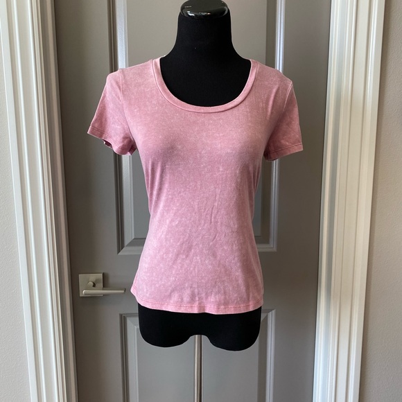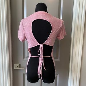 Pink short sleeve top with an open back that ties in two places 33% rayon 62% polyester 5% spandex