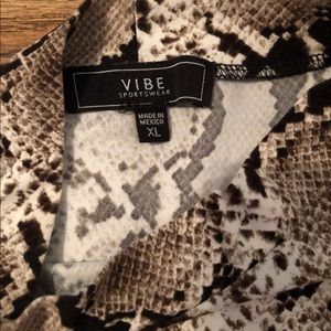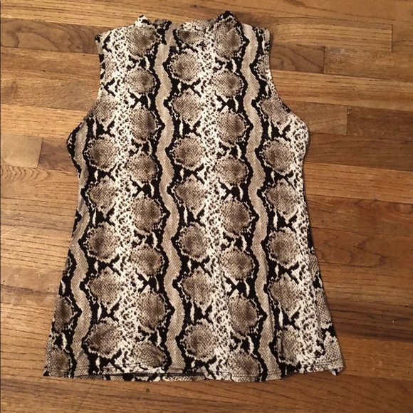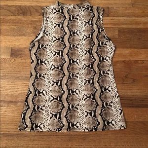 Cute sleeveless, mock turtleneck, snake print too. Polyester and spandex. So cute with a cardigan over it. Size xl