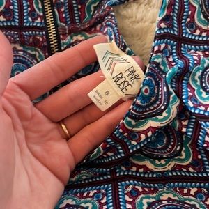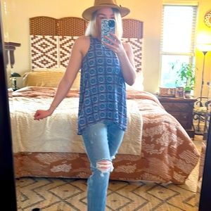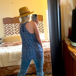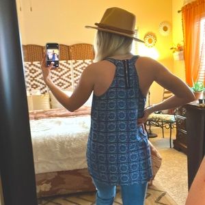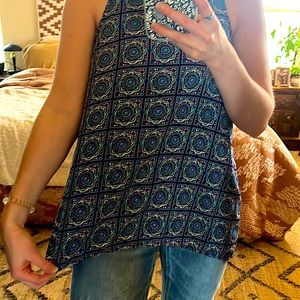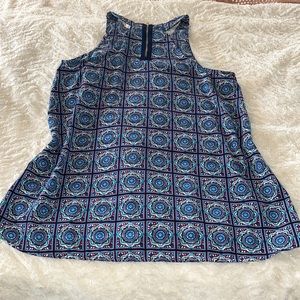 Flowy tank with the cutest repeated print and zipper detail in back for a great fit! This top doesn’t have stretch but is shaped to fit well and the back zipper helps get it off and on easily. Mixture of blue, black, burgundy, and teal. Super comfortable and airy. In gently used condition. Make me a fair offer!(: