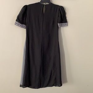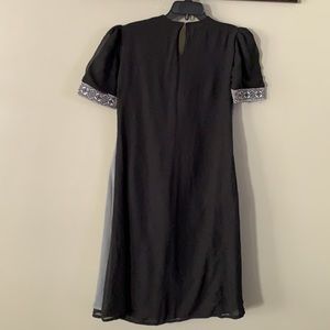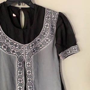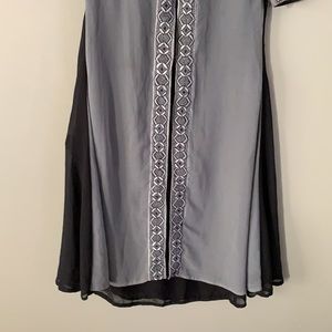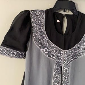 Women’s long kurta without tag, Color: Black and Gray, Size: medium, round neck, nice embroidery design on front.