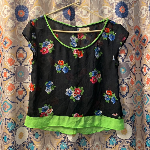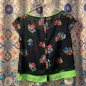 Shear cap sleeve top with button detail down the back, bright flower pattern and contrasting lime green at the collar and hem. This top is so pretty.