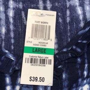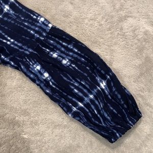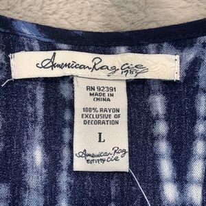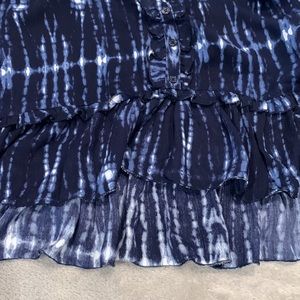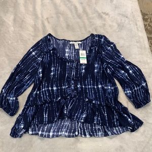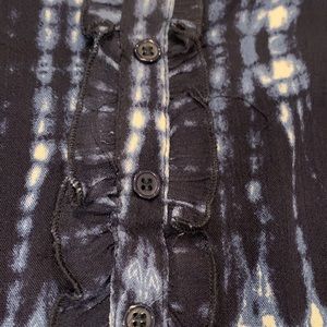 Tie-dye style top with three-quarter sleeves and ruffle bottom hem. Front hem at a higher angle then back hem.