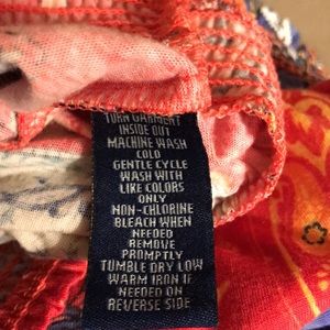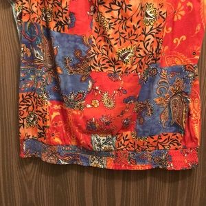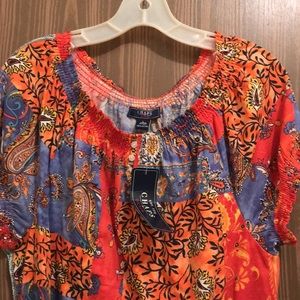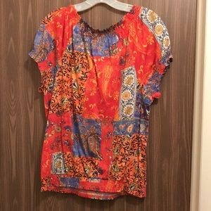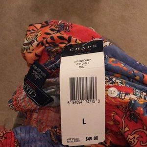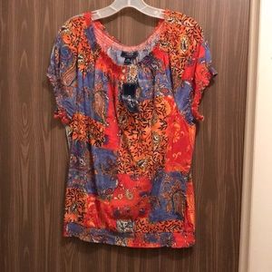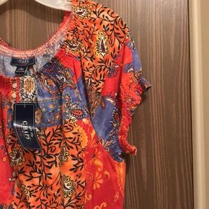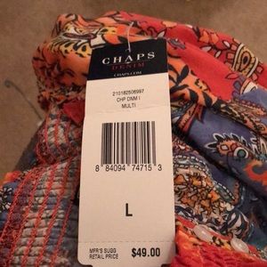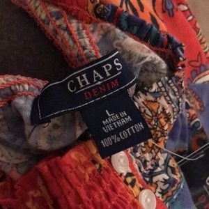 Chaps multi colored top. Gather waist band, neck line and short sleeves size large.