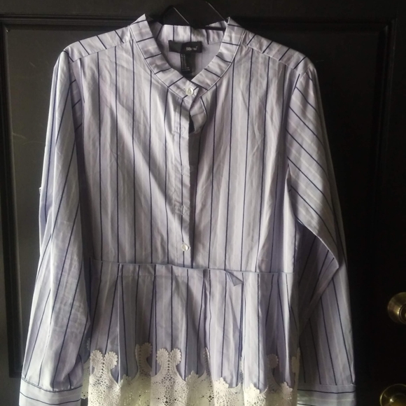 SBetro Button Front Contrast Lace Hem Striped Peplum Blouse