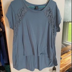 Blue t-shirt. Flowy and Lacey. The back goes below the butt.