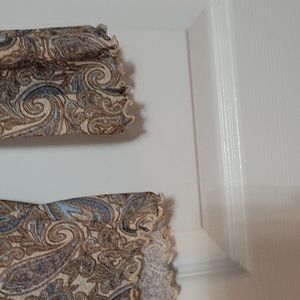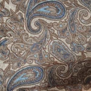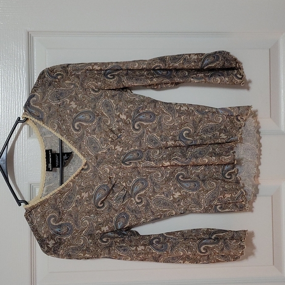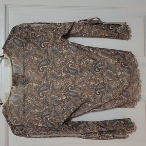 This top is gorgeous! Brown, cream with blue paisley v neck, sheer shirt with slits and ties on the sleeves. Size 3/5