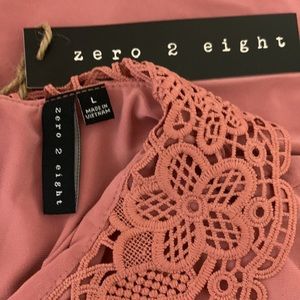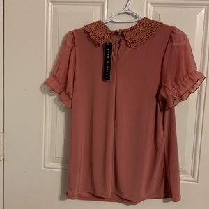 Cute rose color blouse/top, cute sleeves and lace collar; large but fits like medium