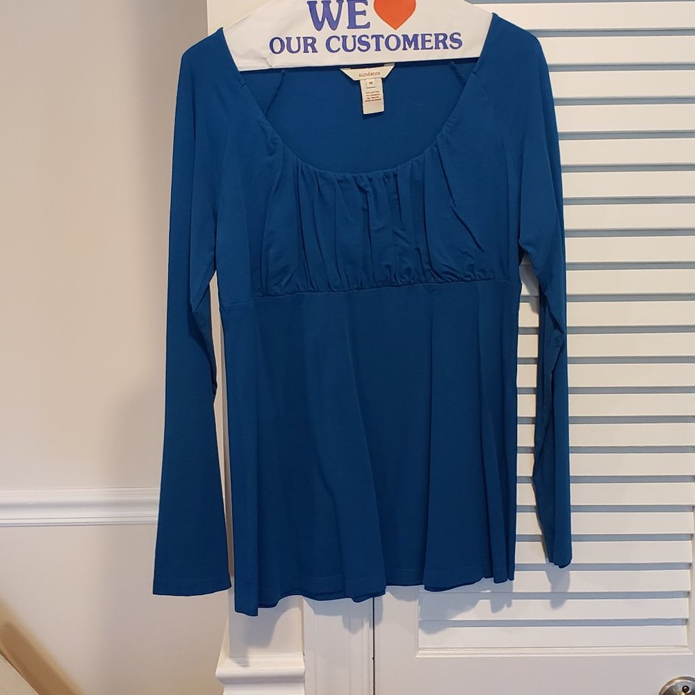 Solid teal long sleeved top with scoop neck and empire waiste.