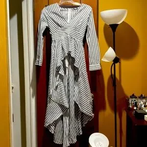Size 4, cute top, front is short and long in the back. Looks really nice with tight jeans.