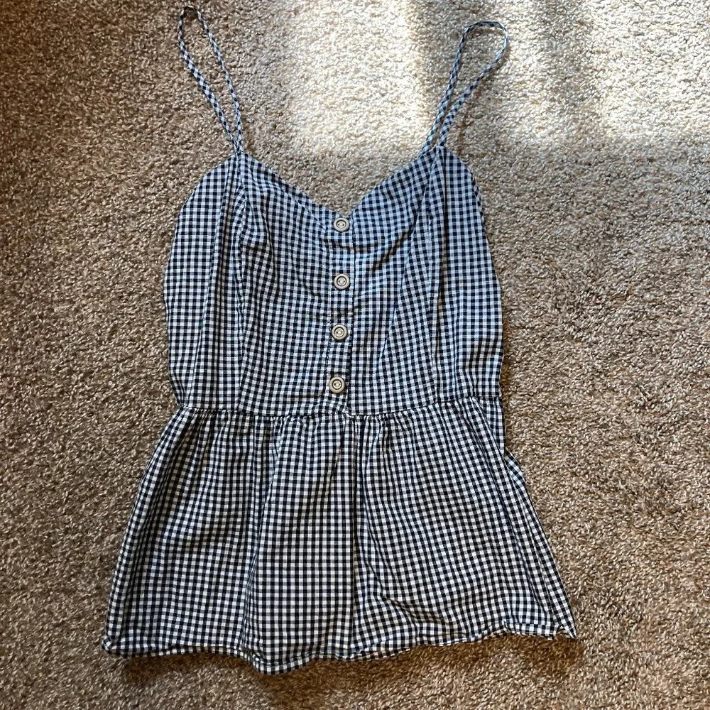 This top is tighter fitting around the bust, and flows out at the bottom. It is black and white with buttons. Size medium